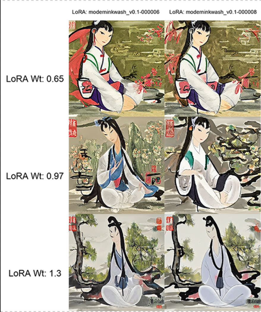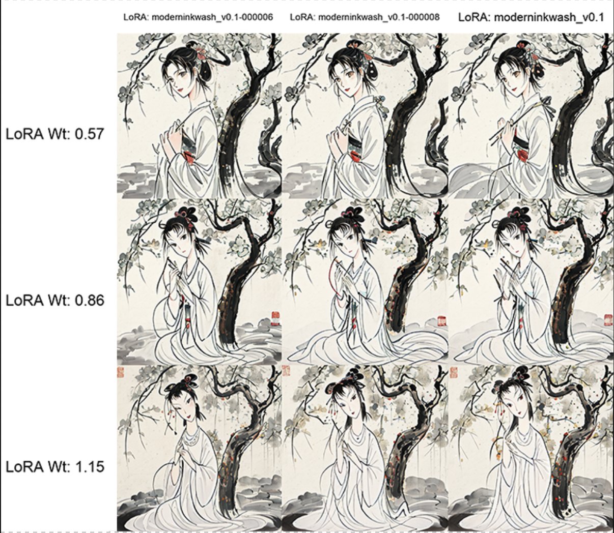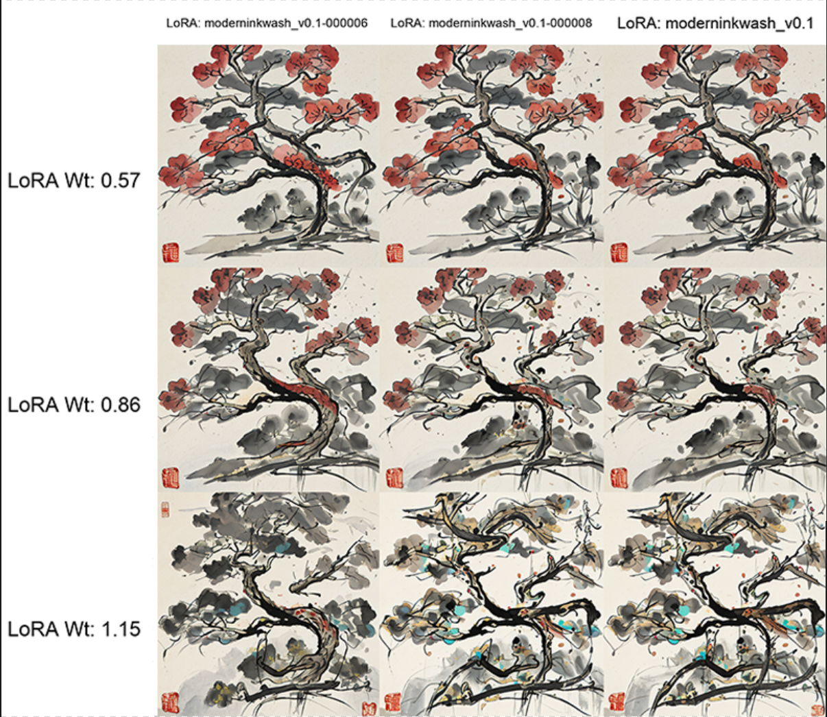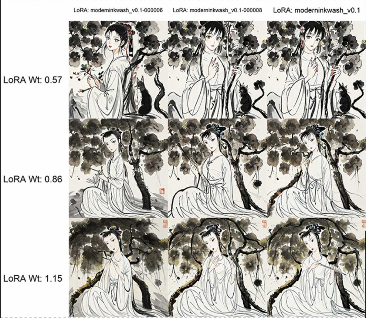 The Modern Inkwash LoRA produces unexpected yet distinctive results across different base models—from Chinese ink painting to Western Impressionism and even Japanese anime—while retaining the essence of both artists’ styles.