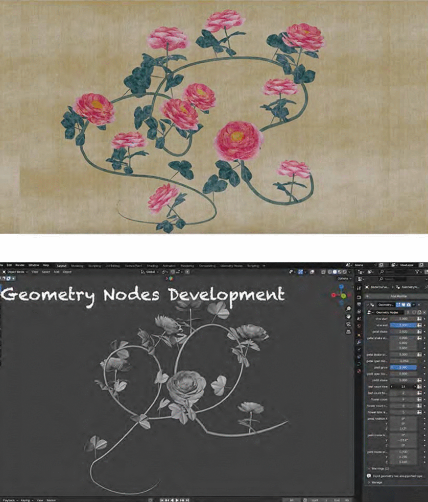A 3D peony rendered in the style of traditional Chinese gongbi floral painting, entirely generated using a self-developed Geometry Nodes modifier, with no manual modeling involved. It allows full control over the flower’s shape, blooming animation, and petal structure through adjustable nodes. The material uses fully procedural textures, enabling flexible color and style variations while preserving the delicate brushwork quality of traditional art.