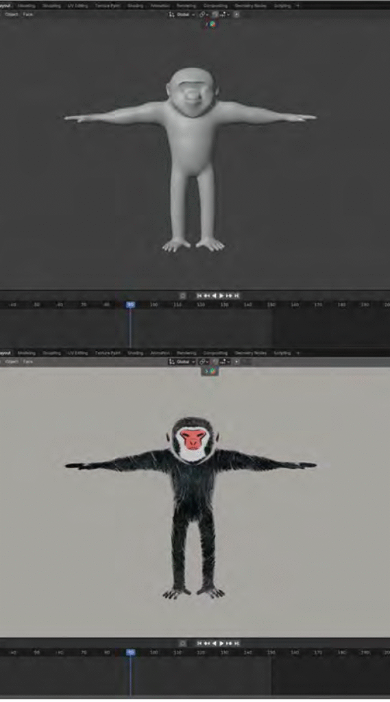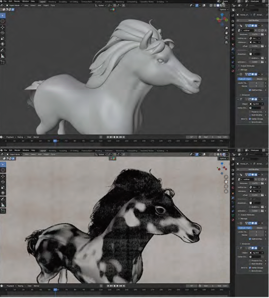 A 3D horse rendered in the style of traditional Chinese ink painting, inspired by Xu Beihong’s expressive brushwork. Fully procedural textures allow flexible adjustment of the ink patterns on the horse’s body. Using a simplified model with a relatively low polygon count, the piece captures the essence of ink brush strokes, enhanced by a self-developed Geometry Nodes modifier that adds dynamic, bold outlines.